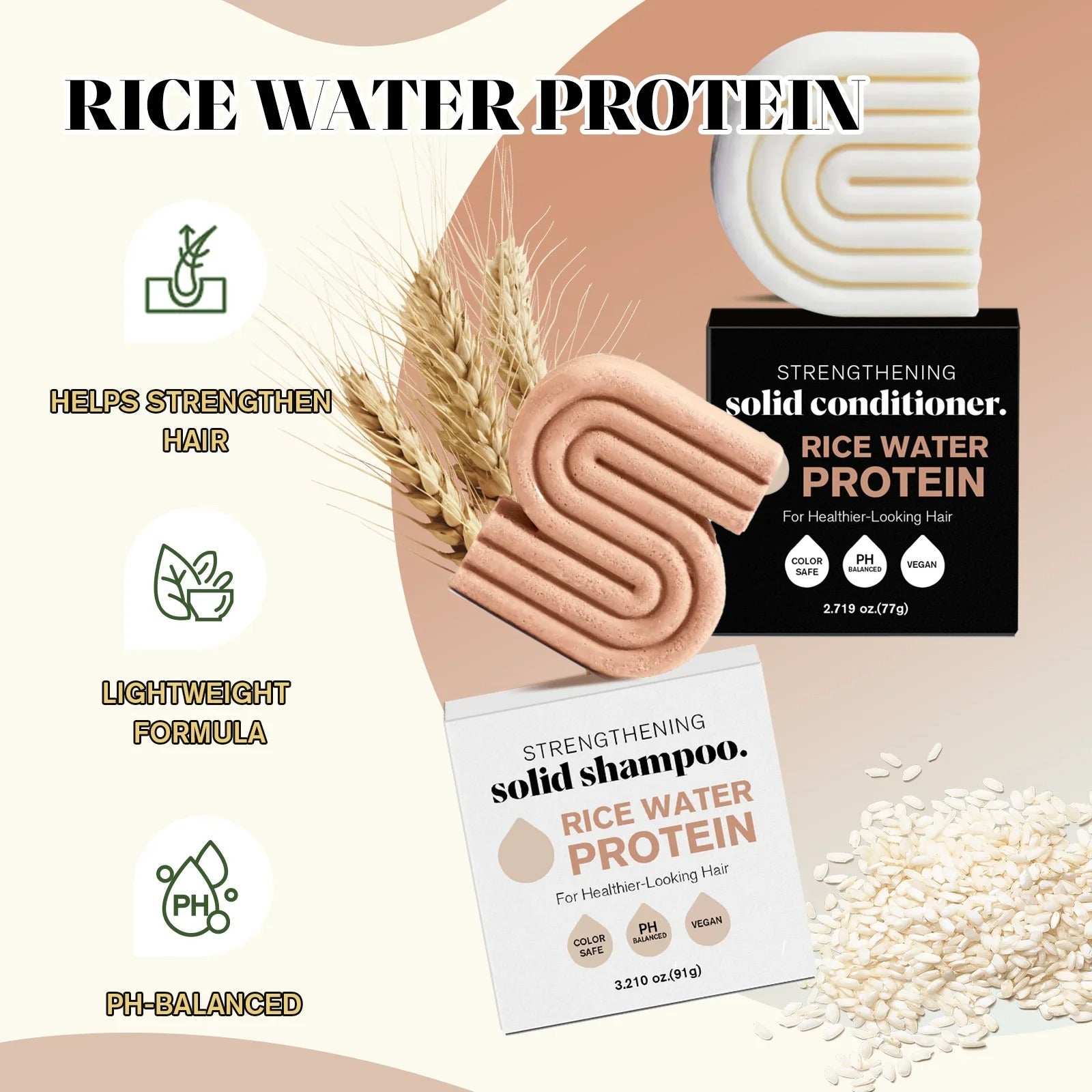 Nourish, strengthen, and shine naturally. Our Rice Water Protein & Rosemary Biotin Haircare Sets are zero-waste shampoo & conditioner bars designed to repair damaged strands, boost hair volume, and enhance shine. Gentle yet effective, these eco-friendly bars suit women and men who want healthy, vibrant hair while caring for the planet. Choose from Strengthening or Volumizing to match your unique hair needs.